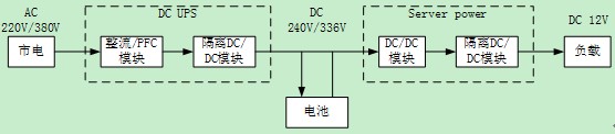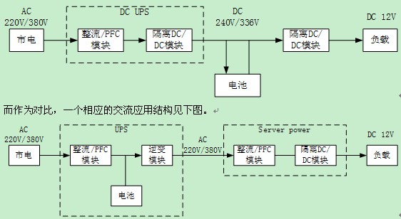 在UPS應(yīng)用的另外一個(gè)分支是目前正在興起的直流UPS系統(tǒng)。直流系統(tǒng)的思路是出于提高效率的目的,減少電源系統(tǒng)中間的轉(zhuǎn)換環(huán)節(jié),電力分配部分由原來(lái)的交流轉(zhuǎn)換成直流。一個(gè)理想的直流UPS系統(tǒng)服務(wù)器應(yīng)用從市電到12V終端的應(yīng)用結(jié)構(gòu)見(jiàn)下圖。