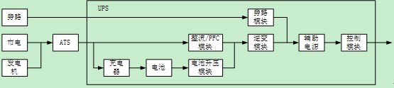 從單個(gè)UPS的設(shè)計(jì)來(lái)說(shuō),可以把整個(gè)產(chǎn)品按照模塊進(jìn)行劃分,下面圖中是一個(gè)典型的UPS系統(tǒng)結(jié)構(gòu)圖