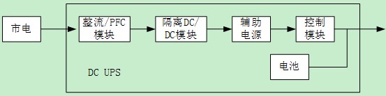 在這種直流UPS體系里面,不存在交流UPS中的旁路回路了,只存在一個(gè)市電到電池回路,這個(gè)回路也兼有充電器的作用。因此從單個(gè)UPS的可用靠性角度考慮,直流UPS可靠性鏈路只有兩條,其中一條是兩級(jí)變換加上輔助電源與控制板,另外一條是電池,見(jiàn)下圖所示