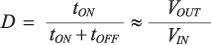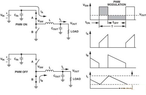 目前的低功耗同步降壓調節器以脈寬調制(PWM)為主要工作模式。PWM保持頻率不變,通過改變脈沖寬度(tON)來調整輸出電壓。輸送的平均功率與占空比D成正比,因此這是一種向負載提高功率的有效方式。