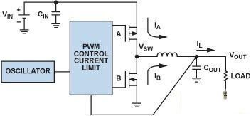 在圖 3 中,開關 A 和開關 B 分別利用 PFET 和 NFET 開關實現,構成一個同步降壓調節器。“同步”一詞表示將一個 FET 用作低端開關。用肖特基二極管代替低端開關的降壓調節器稱為“異步”(或非同步)型。處理低功率時,同步降壓調節器更有效,因為 FET 的壓降低于肖特基二極管。然而,當電感電流達到 0 時,如果底部 FET 未釋放,同步轉換器的輕載效率會降低,而且額外的控制電路會提高 IC 的復雜性和成本。