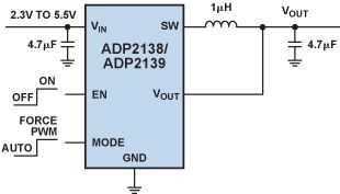 ADP2138 是一款緊湊型 800 mA、3 MHz、降壓 DC-DC 轉換器。圖 4所示為典型應用電路。圖 5顯示了強制 PWM工作模式下和自動 PWM/PSM 工作模式下的效率改善情況。由于頻率存在變化,PSM 干擾可能難以濾除,因此許多降壓調節器提供一個 MODE 引腳(如圖 4 所示),用戶可以通過該引腳強制器件以連續 PWM 模式工作,或者允許器件以自動 PWM/PSM 模式工作。MODE 引腳既可以通過硬連線來設置任一工作模式,也可以根據需要而動態切換,以達到省電目的。