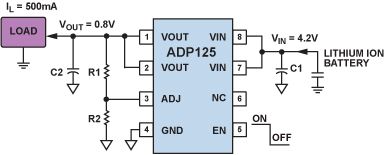 電池的續航時間是新型便攜式設備設計高度關注的一個特性。提高系統效率可以延長電池工作時間,降低更換或充電的頻度。例如,一個鋰離子充電電池可以使用ADP125 LDO以 0.8 V電壓驅動一個 500 mA負載,如圖 6 所示。該LDO的效率只有 19% (VOUT/VIN × 100% = 0.8/4.2 × 100%)。LDO無法存儲未使用的能量,因此剩余的 81%的功率(1.7 W)只能以熱量形式在LDO內部耗散掉,這可能會導致手持式設備的溫度迅速上升。如果使用ADP2138 開關調節器,在 4.2 V輸入和 0.8 V輸出下,工作效率將是 82%,比前一方案的效率高出 4 倍多,便攜式設備的溫度升幅將大大減小。這些系統效率的大幅改善使得開關調節器大量運用于便攜式設備。