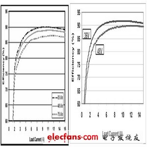 Maxim電源部制作了一款基于MAX5051的隔離電源模塊,圖2是詳細(xì)的電氣原理圖。我們將該電源模塊與市場(chǎng)上流行的電流模式同步整流推挽電源模塊(這里我們稱其為非定制模塊)進(jìn)行了比較,從所測(cè)試的效率曲線(圖3)可以看出,基于MAX5051的模塊效率明顯提高。輕載時(shí),比如1A輸出負(fù)載,MAX5051模塊電源的效率大于62%,而非定制模塊的效率則小于58%。在輸出功率為半載時(shí)(7.5A),MAX5051模塊效率為92%,非定制模塊效率是88%。滿功率負(fù)載時(shí),MAX5051模塊電源的效率仍比非定制模塊效率高出4%。從效率曲線對(duì)比,可以得出雙管正激電路能夠更好的滿足模塊電源高效率的要求。
