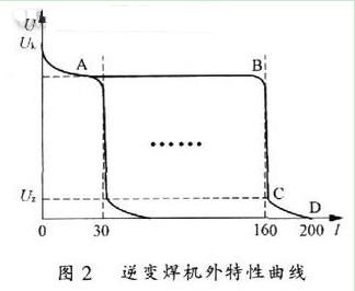圖2所示即為高頻逆變焊機所普遍采用的一種行之有效的恒流帶外拖的外特性曲線。其中Uk為空載電壓,即焊機不工作時的輸出電壓。一個較高的空載電壓有助于起弧階段快速建立起穩定的工作狀態。一般空載電壓為90V左右;AB段為起弧階段,即焊機建立工作狀態的過渡過程,近似于恒壓輸出。這個過程中變換器以最大脈寬輸出,以最快速度達到設定工作電流時該階段結束;BC段為穩定工作階段,近似為恒流過程,使焊機具有一個平穩、恒定的工作電流;CD段為外拖階段,由于焊機在頻繁的起弧和工作過程中焊槍很容易和工件短路粘連,造成焊接過程不順暢,如果此時系統檢測到一個較低的短路電壓后能夠相應地增大輸出電流值,就可以將粘連部分熔斷,從而獲得一個連續、平穩的焊接過程。