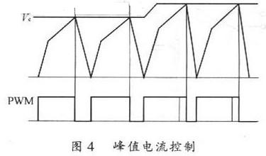 在本方案所采用的峰值電流控制模式下,腳19(RAMP)端的鋸齒波信號是從變壓器原邊的電流信號經采樣整流得到的。但由于實際上原邊電流信號波形上升斜率較緩,與給定比較時,容易因為干擾或毛刺抖動產生誤動作。因此實際應用時,先將原邊電流的采樣整流值與芯片定時電容CT上的鋸齒波相疊加,經過斜坡補償后,再送入腳19(RAMP)端進行比較控制。峰值電流控制過程如圖4所示。