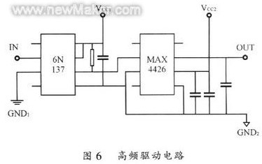其中IN接自來于UC3879的輸出脈沖信號,CND1接控制電路地信號,GND2接被驅動MOS-FET的源極。6N137是一個高速光耦,傳輸延遲時間僅有40 ns。從控制電路來的信號經過光耦隔離后送至驅動電路,使得控制電路和驅動電路有較好的電氣隔離,消除對控制電路的十擾。MAX4426是一個專門用于M0SFET的高頻驅動芯片,其內部有兩個驅動電路,可以很容易地并聯以提供較大的輸出功率。典型上升、下降時間僅為20ns,延遲時間小大于40ns,可工作于1MHz,提供1.5A的峰值輸出電流。