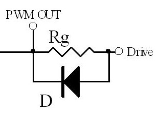 以上討論的是MOSFET ON狀態時電阻的選擇,在MOSFET OFF狀態時為了保證柵極電荷快速瀉放,此時阻值要盡量小.通常為了保證快速瀉放,在Rg上可以并聯一個二極管.當瀉放電阻過小,由于走線電感的原因也會引起諧振(因此有些應用中也會在這個二極管上串一個小電阻),但是由于二極管的反向電流不導通,此時Rg又參與反向諧振回路,因此可以抑制反向諧振的尖峰.這個二極管通常使用高頻小信號管1N4148.