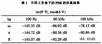 表1為輸出電壓bg在不同工藝角下的PSR的仿真結果,本電路在不同工藝角下都能在高電源干擾的芯片中正常工作。