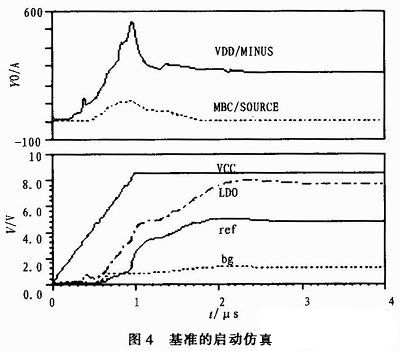MBC控制作用的簡述:在1μs時流過100μA的啟動電流,當LDO、ref、bg建立最低工作電壓后,啟動電路開始關斷過程,電流急劇減小,并最終在2μs時接近0A。整個電路正常運行時消耗的電流是266μA。