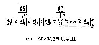 要得到正弦電壓的輸出,就要使逆變電路的控制信號以SPWM方式控制功率管的開關,所得到的脈沖方波輸出再經過濾波就可以得到正弦輸出電壓。通過SG3525來實現輸出正弦電壓,首先要得到SPWM的調制信號,而要得到SPWM調制信號,必須得有一個幅值在1~3.5V,按正弦規律變化的饅頭波,將它加到SG3525腳2,并與鋸齒波比較,就可得到正弦脈寬調制波實現SPWM的控制電路框圖如圖3(a)所示,實際電路各點的波形如圖3(b)所示。