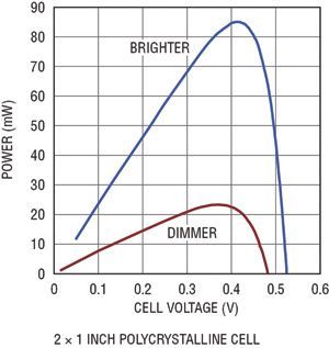 用光伏電池可產生多少功率取決于多種因素。電池的輸出功率與投射到電池上的光強度、電池的總面積以及電池的效率成正比。大多數光伏電池都規定在完全直射的太陽光 (1000W/m2) 下使用,但是在大多數應用中,不可能有這么理想的條件。就依靠太陽光工作的設備來說,可從電池獲得的峰值功率可能非常容易變化,由于天氣、季節、煙霧、灰塵和太陽光入射角的變化,今天與明天相比有可能相差10倍。在充足的太陽光照下,晶體電池視電池特性的不同而有所不同,典型輸出功率約為每平方英寸40mW。面積為幾平方英寸的光伏電池足夠給多個遠程傳感器供電以及給電池涓流充電了。