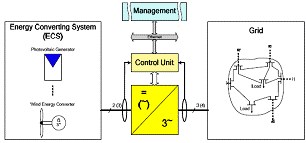 今天,DERs和RESs所使用的逆變器仍然主要采用了被動控制技術。這意味著對電網接入功率的控制與通過一次能源產生電能的能量轉換系統密切相關。對電網側來說,它們相當于負的負載。它們將從ECS處獲得的全部功率注入電網。在這種方式下,電網側的電網控制整合,甚至于主動參與控制和穩定電網狀態變量都是不可能的。