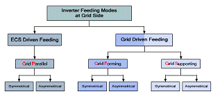 在ECS驅動饋電時,ECS決定了向電網傳輸的功率。如今,單臺RESs逆變器典型地就在這種饋電方式下運行,并向電網注入全部可提供的功率。在電網驅動饋電時,不再是ECS,而是電網決定功率的傳輸。典型的,大多數常規大型電廠運行在這種方式下,同樣,這種方式潛在的適合DERs和RESs系統,或者至少適合混合式電力系統。在ECS驅動饋電的情況下,逆變器控制方式被稱作電網平行方式。第二種情況可以被兩種不同的逆變器控制方式實現,分別是電網形成方式和電網支持方式。電網形成方式中逆變器的作用是建立和維持電網狀態變量。電網支持方式中逆變器被用于平衡功率。它可以傳輸預先設定數量的功率,這個數量可以根據電力系統的需要或者高級控制運行得到的參考值進行調整。應用這個控制方式的逆變器例子如圖3至圖5的左側所示。此外,這些基本有功功率調控器潛在的對二次電網控制的相互聯系可以被類似的闡釋。
