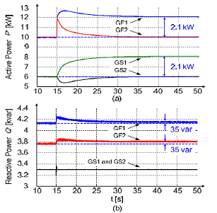 圖7描述了逆變器的有功功率。最初,每個電網形成方式的逆變器都提供10kW功率,電網支持方式的逆變器都提供6kW功率。于是,兩個電網形成方式的逆變器和兩個電網支持方式的逆變器平均分攤負載功率。15s時,4.2kW的負載階躍功率被加到第一個電網上。隨著負載改變,所有的逆變器都馬上做出了反應,功率的產生和消耗被重新分配。