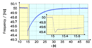 電力系統的頻率如圖8所示。由于一次和二次控制都影響電網頻率,但是影響是在不同的時間尺度,快速控制器的反應如放大窗口所示。