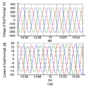 第一個電網形成方式的逆變器在連接點處的電壓和電流如圖9所示。逆變器電壓幾乎不受干擾,與此同時,只有電流去適應相關負載情況。