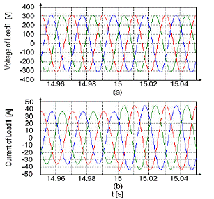 圖10 (a) t=15s時加入階躍負載的負載三相電壓 (b) t=15s時加入階躍負載的負載三相電流