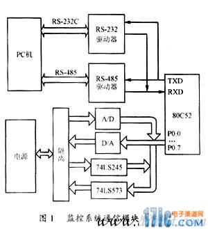 為了組建開關電源監控系統,系統中的每臺電源配置了一個獨立的監控系統通信模塊。監控系統通信模塊采用的控制芯片是MCS51系列單片機80C52。80C52具有8k的內部ROM和256字節的內部RAM。監控系統通信模塊電路結構圖如圖1所示。計算機通過該通信模塊可以實時讀取電源的輸出電壓、輸出電流值以及輸出過壓、輸入過壓、輸入欠壓、過流、過熱、運行/停止等8路開關量的狀態值,并可以在輸出值允許的范圍內任意設置電源的輸出電壓、輸出電流值和復位、合閘、分閘、機控/本控4路開關量的狀態值。從監控系統通信模塊電路結構示意圖可以看出,如果計算機需要讀取電源模塊的輸出電壓、輸出電流值和開關量的狀態時,單片機收到請求命令后啟動A/D轉換芯片MAX182對電源的輸出電壓、輸出電流兩路模擬量進行轉換,轉換后的數據送入單片機進行數據處理。同時表征電源運行狀態的8路開關量從雙總線收發器74LS245讀入送至單片機寄存器存貯。單片機將所有處理后的數據按預定數據傳送格式發送給計算機輸出顯示。計算機需要設置電源的輸出電壓、輸出電流值和4路開關量的狀態時,計算機將設置好的數據按預定格式發送給單片機。單片機接收處理后啟動D/A轉換芯片MAX532和輸出鎖存器74LS573將處理后的輸出電壓、輸出電流值和開關量狀態值輸出給電源。監控系統通信模塊從而實現了計算機對電源的實時監控。為了保證設計人員的安全和防止通信模塊受電源影響而損壞,電源與通信模塊之間的信號傳遞均通過光耦隔離。