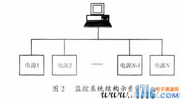 主從總線1∶N通信方式可以采用多種通信協議實現總線使用權的分配,本系統中使用的地址查詢方式,主從總線1∶N通信方式的監控系統結構示意圖如圖2所示。系統給每個電源分配唯一的一個地址號,計算機分配一個固定的地址號。當計算機需要和某臺電源建立通信時,計算機發出一個含有該電源地址號的請求命令包。掛在總線上的所有電源一直處于等待接收數據狀態,計算機所發出的請求命令包將被所有的電源所接收。每個電源將接收到的請求命令包中所包含的電源地址號與本模塊的地址號相比較,只有地址號與計算機所發出的請求命令包中所包含的地址號相同的電源才與計算機建立通信,響應計算機所發出的請求命令。其它地址號不相同的電源將拒絕響應計算機的請求命令,繼續保持接收數據狀態,等待響應計算機發出的下一個請求命令包。系統中的這種地址查詢方式實現了任何時候總線上最多只有一臺電源與計算機通信,其它電源處于等待接收數據狀態,從而有效地避免了總線使用權的沖突。