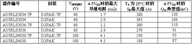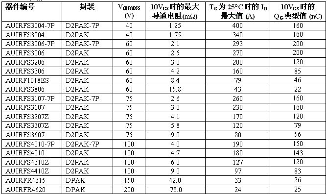 全新溝道 HEXFET 功率 MOSFET 系列采用多款表面貼裝器件 (SMD) 封裝,電壓范圍從 40V 至 200V。標準和邏輯電平柵級驅動 MOSFET 都為 IR 車用塑料封裝 MOSFET 產品系列設定了導通電阻性能新標準。基準導通電阻在 40V 下最大為 1.25 毫歐,60V 下最大為2.1 毫歐,75V 下為 2.6 毫歐,100V 下為 4.0 毫歐。在 D2Pak-7P 封裝中許多器件的最大額定電流達 240A。