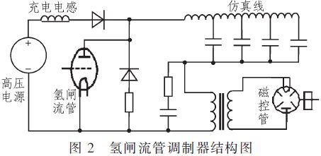 以氫閘流管ZQM1-350/14型為例,其參數(shù)為14 000 V/350 A,陶瓷外殼,需要12.6 V/6 A的燈絲電源。其關(guān)斷時(shí),高壓電源經(jīng)充電電感和變壓器的原邊給仿真線充電,氫閘流管接通時(shí),仿真線經(jīng)氫閘流管對變壓器原邊放電,在變壓器的副邊產(chǎn)生高壓脈沖去調(diào)制磁控管。氫閘流調(diào)制器的結(jié)構(gòu)如圖2所示。