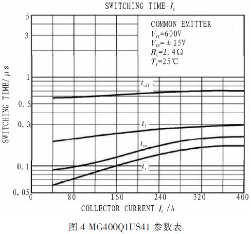 功率開關(guān)管IGBT采用高速型MG400Q1US41,其參數(shù)為1 200V/400A,其參數(shù)如圖4所示。工程中采用十管串聯(lián)的方法以適應(yīng)高電壓的要求。驅(qū)動模塊采用M57962L,其參數(shù)為1 200 V/400 A。