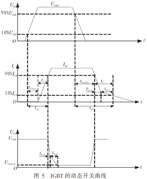 根據(jù)調(diào)制器的要求,由單片機(jī)輸出一定重復(fù)頻率的觸發(fā)脈沖經(jīng)接口保護(hù)電路轉(zhuǎn)換后驅(qū)動IGBT的柵極。IGBT在柵極有驅(qū)動時(shí)接通,無驅(qū)動時(shí)關(guān)斷,實(shí)現(xiàn)了可控的開關(guān)功能。IGBT的動態(tài)開關(guān)曲線如圖5所示。