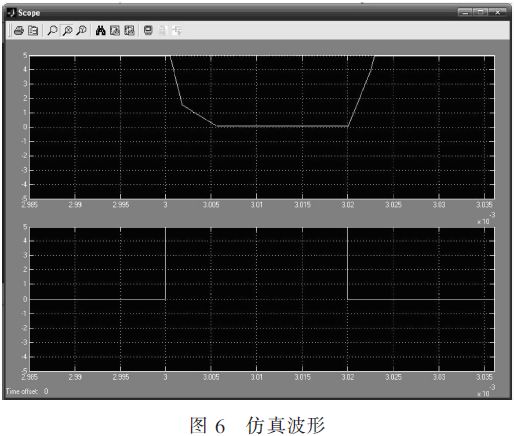 設(shè)觸發(fā)脈沖周期為2 ms,脈沖寬度為2μs,如圖6中的第一示波器(圖的下部),仿真線前端的波形如圖6中的第二示波器(圖的上部)。由第二示波器可見,當(dāng)觸發(fā)脈沖到來時(shí),即IGBT網(wǎng)絡(luò)導(dǎo)通時(shí),仿真線迅速放電,放電速率為5 000 V/6μs(即從滿電壓5 000 V至放電完成時(shí)間約為6μs),并且無反沖。當(dāng)觸發(fā)脈沖過去時(shí),即IGBT網(wǎng)絡(luò)斷開時(shí),仿真線迅速充電,放電速率為5 000 V/3μs(即從充電開始至滿電壓5 000 V的時(shí)間約為3μs),并且無反沖。