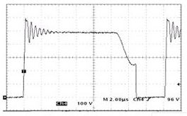 相對于一般的反激式變換器,準(zhǔn)諧振只在原來電路基礎(chǔ)上加了一個無源器件電容器,不會在電路中產(chǎn)生多余的電磁噪聲。通過改變控制方式,利用變壓器初級電感與電容器之間發(fā)生諧振,在開關(guān)管電壓波形出現(xiàn)波谷處開通;關(guān)斷時利用電容器進(jìn)行緩沖,可以大大降低開關(guān)管上的關(guān)斷電壓尖峰和開通電流尖峰,從而降低電磁干擾。利用安森美的NCP1207制作的準(zhǔn)諧振反激式開關(guān)電源,其開關(guān)管上的電壓波形如圖6所示:
