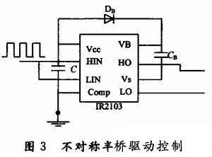 不對稱半橋驅(qū)動電路,如圖3所示。驅(qū)動集成芯片采用IR公司的IR2103,其輸出級作為推挽驅(qū)動輸出,以直接耦合的方式與主電路的開關(guān)管相連接,由HO和LO的輸出分別作為驅(qū)動橋式電路的上、下橋臂。為了實現(xiàn)上橋臂驅(qū)動電路的地電位與主電路的同步浮動,采用由DB和CB組成的外接自舉電路。