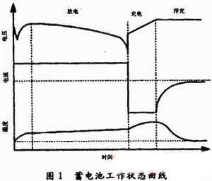 蓄電池在工作工程中主要具有3種工作狀態(tài):放電狀態(tài)、充電狀態(tài)和浮充狀態(tài)。處于放電狀態(tài)時,蓄電池將儲蓄的化學能轉(zhuǎn)化為電能供給負載;充電狀態(tài)是在蓄電池放電之后進行能量儲蓄的狀態(tài),此種狀態(tài)下電能轉(zhuǎn)化為化學能存儲起來;浮充狀態(tài)則是蓄電池維持一定化學能存儲量所要保持的工作狀態(tài),浮充狀態(tài)下的蓄電池的儲能不會因為自放電而損失。放電、充電、浮充電3個狀態(tài)構(gòu)成蓄電池的一個完整的工作循環(huán)。傳統(tǒng)的充電器采用串聯(lián)充電方式,通過各個電池的電流都是一樣的。盡管采用了三段式的充電方法,但是充電時能控制的電壓只是電池組的串聯(lián)電壓,仍然伴有電池組充電不均衡并且擴大的現(xiàn)象。蓄電池工作狀態(tài)曲線如圖1所示。因此在此基礎(chǔ)上采用一種新的解決方法。