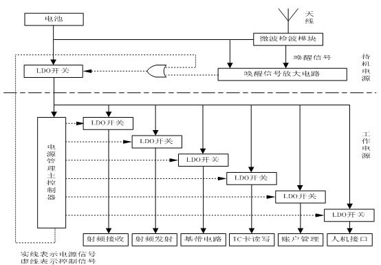 如OBU這種以嵌入式處理器為核心的系統(tǒng),其功耗主要由處理器功耗和外圍電路功耗組成??紤]實(shí)際的運(yùn)行情況,汽車在公路上行駛的整個(gè)過程中,經(jīng)過收費(fèi)站的時(shí)間是非常短的,OBU只需要在汽車經(jīng)過收費(fèi)站時(shí)工作,而且工作時(shí)間不到一秒鐘,其他絕大部分時(shí)間都不需要工作。OBU智能電源管理采用電池供電的方法,控制OBU 工作在兩種模式,睡眠模式和激活模式;當(dāng)車進(jìn)入收費(fèi)站時(shí),OBU被激活,開始工作,處于激活模式;當(dāng)交易完成,車離開收費(fèi)站后,OBU馬上停止工作進(jìn)入睡眠模式。根據(jù)這種特點(diǎn),對(duì)電源采用分級(jí)管理的策略,即分為待機(jī)電源與工作電源,如圖2.1。