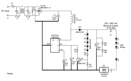 其實這個電源的核心就是一個恒流二極管NSI45025,以確保LED恒流在25mA。所以它只能用于小功率貼片式的LED。其中外加的集成電路NCP1014實際上是一個有源式的功率因數校正(PFC),可以把它的功率因數提高到>0.9以滿足美國能源之星的要求。輸入端的L1,C1,C2是一個防電磁干擾EMI的濾波器。它的缺點是非隔離,所以220V會直接加到負載LED上。但是歐盟IEC 61347-2-13 (5/2006)標準規定在LED負載端電壓不可超過25VAC或35VDC。所以采用非隔離電源是無法出口歐盟的。