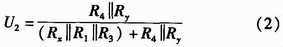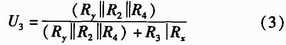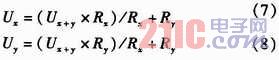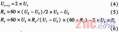 如圖2所示,U+和U-為被測(cè)線路的母線供電電壓,正常工作時(shí)兩母線間的電壓差Ux+y為440 V,且隨蓄電池內(nèi)阻變化。Rx,Ry分別為被測(cè)線路的正母線絕緣電阻和負(fù)母線絕緣電阻。正、負(fù)母線絕緣電阻反映的是64路的正、負(fù)支路的總體絕緣性能,等效于各個(gè)支路的正、負(fù)絕緣電阻的并聯(lián),正常時(shí)兩母線絕緣電阻>20 kΩ。Ux和Uy為正負(fù)母線對(duì)地電壓,大小隨正負(fù)母線的絕緣電阻變化,但兩母線電壓差恒定為Ux+y。為了檢測(cè)正負(fù)母線電壓Ux,Uy,Rx,Ry,系統(tǒng)采用了“平衡-不平衡檢測(cè)法”檢測(cè)母線電壓和母線絕緣電阻。計(jì)算公式如式(1)所示。