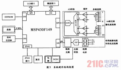 直流接地檢測(cè)系統(tǒng)采用低功耗處理器MSP430F149為硬件核心,外圍電路可分為數(shù)據(jù)采集模塊、人機(jī)交互模塊、處理器模塊。數(shù)據(jù)采集模塊負(fù)責(zé)檢測(cè)64路支路的漏電流、母線電壓、母線絕緣電阻;人機(jī)交互模塊負(fù)責(zé)進(jìn)行液晶顯示和鍵盤(pán)輸入;處理器模塊負(fù)責(zé)協(xié)調(diào)整個(gè)系統(tǒng)的數(shù)據(jù)處理,數(shù)據(jù)存儲(chǔ),人機(jī)交互等。具體的硬件結(jié)構(gòu)框圖,如圖3所示。