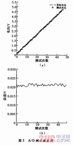 為了達(dá)到好的測(cè)試效果,A/D采集必須達(dá)到一定的測(cè)試精度,圖5是A/D采集的實(shí)測(cè)數(shù)據(jù)和測(cè)試誤差分析曲線,從圖中可以看出,A/D采集的誤差約20 mV,屬于正常范圍,因?yàn)橄到y(tǒng)采用8位A/D,5 V基準(zhǔn)電壓。這個(gè)采樣精度滿足整體的設(shè)計(jì)要求。
