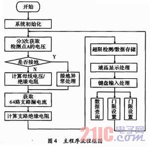 整個(gè)程序的編寫(xiě)均由C語(yǔ)言完成,在程序設(shè)計(jì)中,采用了結(jié)構(gòu)化程序設(shè)計(jì)方法,使各個(gè)模塊程序相對(duì)獨(dú)立,便于程序代碼的維護(hù)、移植和升級(jí)。同時(shí),這樣分離式的程序設(shè)計(jì),降低了代碼的調(diào)試難度,縮短了調(diào)試周期。將與接地故障信息(如母線電壓,母線絕緣電阻,支路絕緣電阻,接地支路號(hào)等)密切相關(guān)的數(shù)據(jù)放在一個(gè)結(jié)構(gòu)體里,便于掉電存儲(chǔ)與回放顯示。系統(tǒng)的主程序流程圖,如圖4所示。