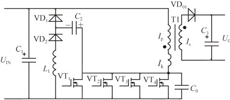 以上過程形成一個完整工作周期,可以看出,變壓器漏感中的能量大部分被回饋到輸入電容C 1中(C 0中有部分能量被消耗掉),所以電源效率得到提高。