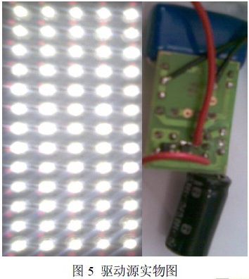 為了進(jìn)一步驗(yàn)證了基于恒流二極管的小功率LED 驅(qū)動(dòng)電路的可行性。制作了驅(qū)動(dòng)65 顆(5*15方式連接)0.06 W 白光LED 的驅(qū)動(dòng)源,其中降壓電容C1 為1.5 μF,濾波電容C2 為1000 μF,恒流二極管為兩顆2DHL040 并聯(lián),并利用萬用表對電流電壓進(jìn)行測量。實(shí)際測得輸入電壓在196~248 V范圍內(nèi)輸出電流恒定為80 mA,相當(dāng)于流過每個(gè)LED 電流為 16 mA。在219 V 輸入電壓條件下,整個(gè)電路消耗的功率為 7.1 W ,則驅(qū)動(dòng)源的功率因素為 0.47。圖5 為制作的小功率驅(qū)動(dòng)源實(shí)物圖。