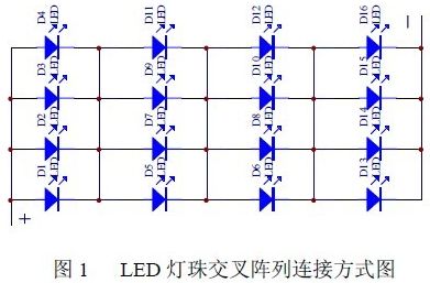 從圖中可以看出當(dāng)其中個(gè)別LED 短路或斷路,也不會(huì)引起整個(gè)燈組熄滅。這種交叉陣列連接方式具有線路簡單,亮度穩(wěn)定,可靠性高,對驅(qū)動(dòng)要求較低等特點(diǎn)。