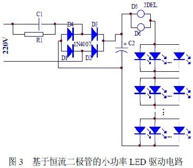 基于恒流二極管的市電供電小功率LED 驅(qū)動(dòng)電路如圖3 所示: