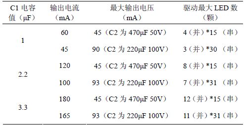 C1 為降壓電容,電容降壓電路輸出電流主要與降壓電容容量和輸出電壓有關(guān),輸出電壓越高電流越小。理論上驅(qū)動(dòng)電路輸出電壓可以達(dá)100 V 以上,但考慮到高電壓下濾波電容C2 的體積較大,不易于電路安裝,本文設(shè)計(jì)的驅(qū)動(dòng)電路主要使用50 V和100 V 的濾波電容。雖然電容容值越大驅(qū)動(dòng)電路輸出電流越大,但降壓電容值太大會(huì)降低整個(gè)驅(qū)動(dòng)電路的安全特性與穩(wěn)定性,因此建議降壓電容的容值不要超過3.3 μF。下表1 給出了采用0.68~3.3 μF不同大小降壓電容,驅(qū)動(dòng)電路在不同電壓下提供的電流以及能夠驅(qū)動(dòng)的最多LED 數(shù)量。(此表中的數(shù)據(jù)為多次實(shí)驗(yàn)與仿真所得)