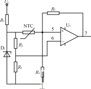 圖4為變壓器過熱保護電路,R3=R4,NTC為粘貼在變壓器上的負溫度系數的熱敏電阻,常溫下RNTCR2,運放U1構成滯環比較器。正常工作時,NTC阻值較大,運放U+<U-,輸出為零;當溫度上升到設定值時,運放U1輸出為高電平,送到PWM控制芯片使輸出脈沖關斷。