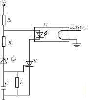 圖5為輸出過電壓保護電路。穩壓管DZ的擊穿電壓稍大于輸出電壓額定值,輸出正常時,DZ不導通,晶閘管V門極電壓為零,不導通。當輸出過壓時DZ擊穿,V受觸發導通,使光耦輸出三極管電流增大,通過UC3843控制開關管關斷。