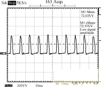 圖8~圖10為輸入電壓220V的條件下,輸出端的負載狀況分別為空載、半載和全載時,輸入端的功率波形圖。由這3個圖可以看出,輸入功率是個脈沖序列,周期為10ms,即每半個工頻周期電源輸入端通過整流橋為輸入平滑濾波電容充一次電。測量輸入功率時串聯于輸入端的采樣電阻為2.0Ω,因此功率為圖示值除以2。半載時輸出功率為:12.3662/10=15.29W,全載時輸出功率為:12.2552/5=30.04W。電路正常工作時,漏極電壓波形如圖11所示。