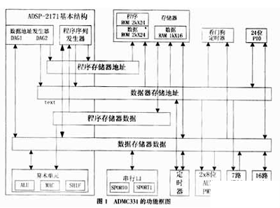 ADMC331是美國模擬器件公司(ADI)推出的基于DSP技術的電機控制器,它在內部集成了一個26MIPS(每秒百萬條指令)的定點數字信號處理器內核,同時內部還包括整套電機控制外圍線路,從而為用戶快速、高效地開發(fā)電機控制器創(chuàng)造了十分有利的條件。ADMC331的功能框圖如圖1所示,其主要特性如下: