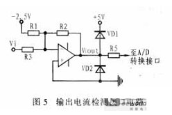 ADMC331內的A/D轉換器由7個模擬輸入通道和比較器等電路組成,數據轉換是通過判斷模擬輸入量與片內高穩(wěn)定度鋸齒波的交點來實現的。考慮到A/D 轉換器能接受的電平范圍為0~+5V,因此必須將電壓互感器檢測的電壓和電流傳感器檢測的電流(轉換為電壓量)按照一定比例轉換到這個范圍內。輸出電壓和電流檢測接口電路分別如圖4和圖5所示,這部分電路的輸入阻抗應比較大,以盡量減少對設備信號的影響,并且輸出阻抗應同A/D轉換器的輸入阻抗相匹配。