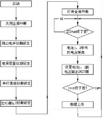 為了驗證本文的均衡充電方法,以兩節單體電池組成的蓄電池組為例進行實驗和分析,主要驗證旁路中開關管對電壓的調節作用??刂屏鞒桃妶D4。