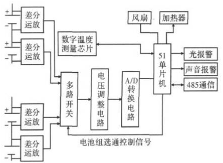 具有高電壓、高容量、循環(huán)壽命長(zhǎng)、安全性能好等優(yōu)點(diǎn)的鋰離子電池,在便攜式電子設(shè)備、電動(dòng)汽車、空間技術(shù)、國(guó)防工業(yè)等多方面具有廣闊的應(yīng)用前景。由若干節(jié)鋰離子電池經(jīng)串聯(lián)組成的動(dòng)力鋰離子電池組目前應(yīng)用最為廣泛。由于每節(jié)單體電池的電壓不一致,使用中電池不允許過充電、過放電,電池的性能和壽命受溫度影響較大等特點(diǎn),必須對(duì)串聯(lián)鋰離子電池組進(jìn)行監(jiān)測(cè),確保在使用中鋰離子電池具有良好的狀態(tài),或者使用中電池出現(xiàn)問題立即報(bào)警,電源管理系統(tǒng)立即采取保障措施,并提醒相關(guān)人員檢修。單體電壓和電池組的溫度是辨別串聯(lián)鋰離子電池組是否正常工作的主要技術(shù)指標(biāo)。采用直接采樣法,將要測(cè)量的單體電池電壓存儲(chǔ)在非電容上進(jìn)行測(cè)量。該方法反應(yīng)時(shí)間慢、誤差較大、控制復(fù)雜; 采用運(yùn)放和光藕繼電器來測(cè)量串聯(lián)電池組的單體電壓。該方法對(duì)光耦的線性度要求很高,導(dǎo)致硬件成本較高。目前,直接采用集成芯片的串聯(lián)鋰離子電池組監(jiān)控系統(tǒng)受到青睞,但該方法串聯(lián)電池的數(shù)目固定,導(dǎo)致應(yīng)用不靈活、硬件成本高等缺點(diǎn)。文中研制了一種動(dòng)力鋰離子電池組監(jiān)測(cè)系統(tǒng),對(duì)串聯(lián)鋰離子電池組的單體電壓和電池組的溫度進(jìn)行在線監(jiān)測(cè),當(dāng)單體電池電壓偏離規(guī)定區(qū)間時(shí),監(jiān)測(cè)系統(tǒng)啟動(dòng)報(bào)警程序進(jìn)行聲、光報(bào)警; 當(dāng)電池組溫度偏離規(guī)定的區(qū)間時(shí),監(jiān)測(cè)系統(tǒng)啟動(dòng)風(fēng)扇或加熱控制電路,并存儲(chǔ)有關(guān)數(shù)據(jù),確保電池組正常工作。整個(gè)監(jiān)測(cè)系統(tǒng)具有連續(xù)測(cè)量分量、簡(jiǎn)單經(jīng)濟(jì)、精度高和可靠性高的特點(diǎn)。